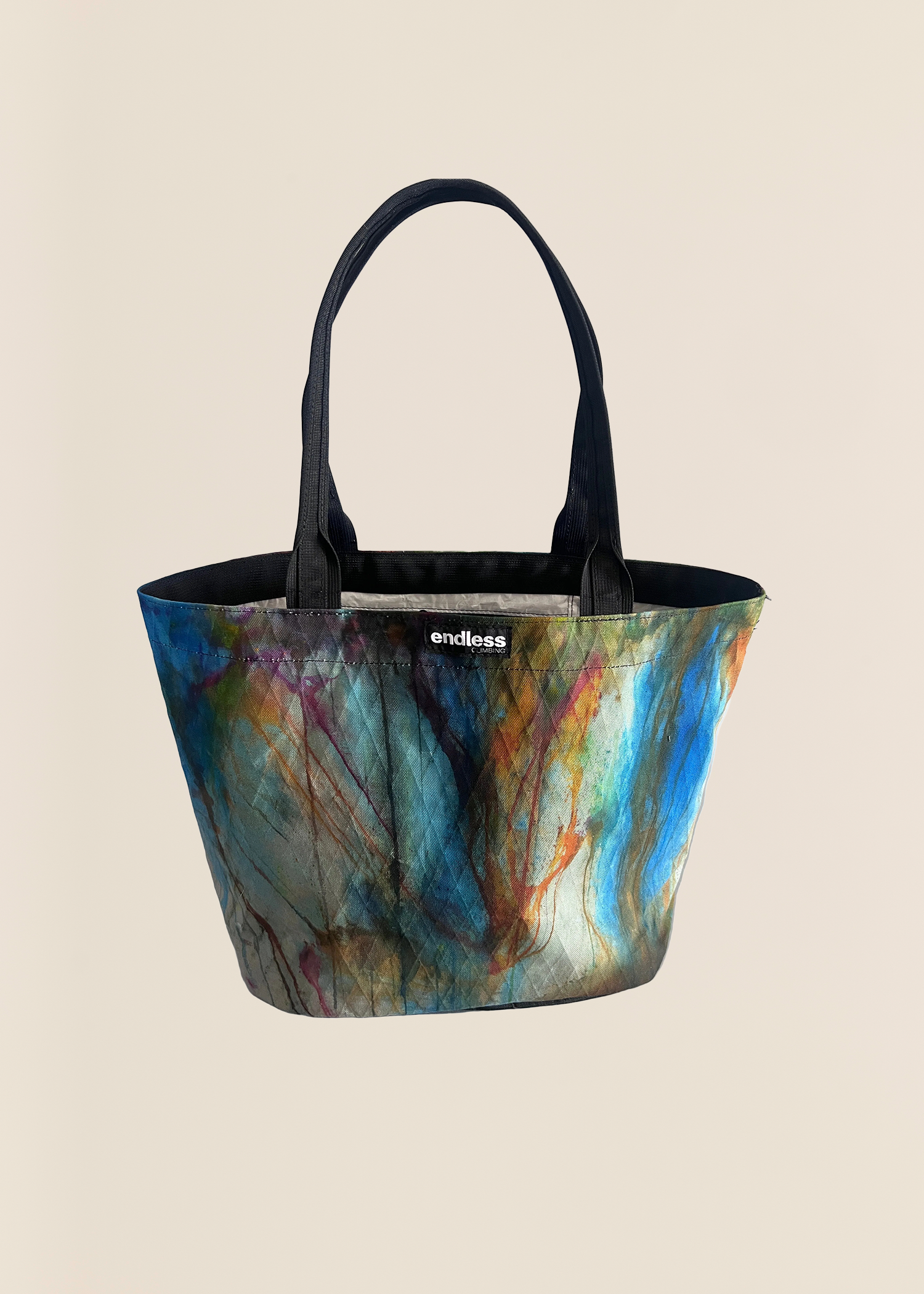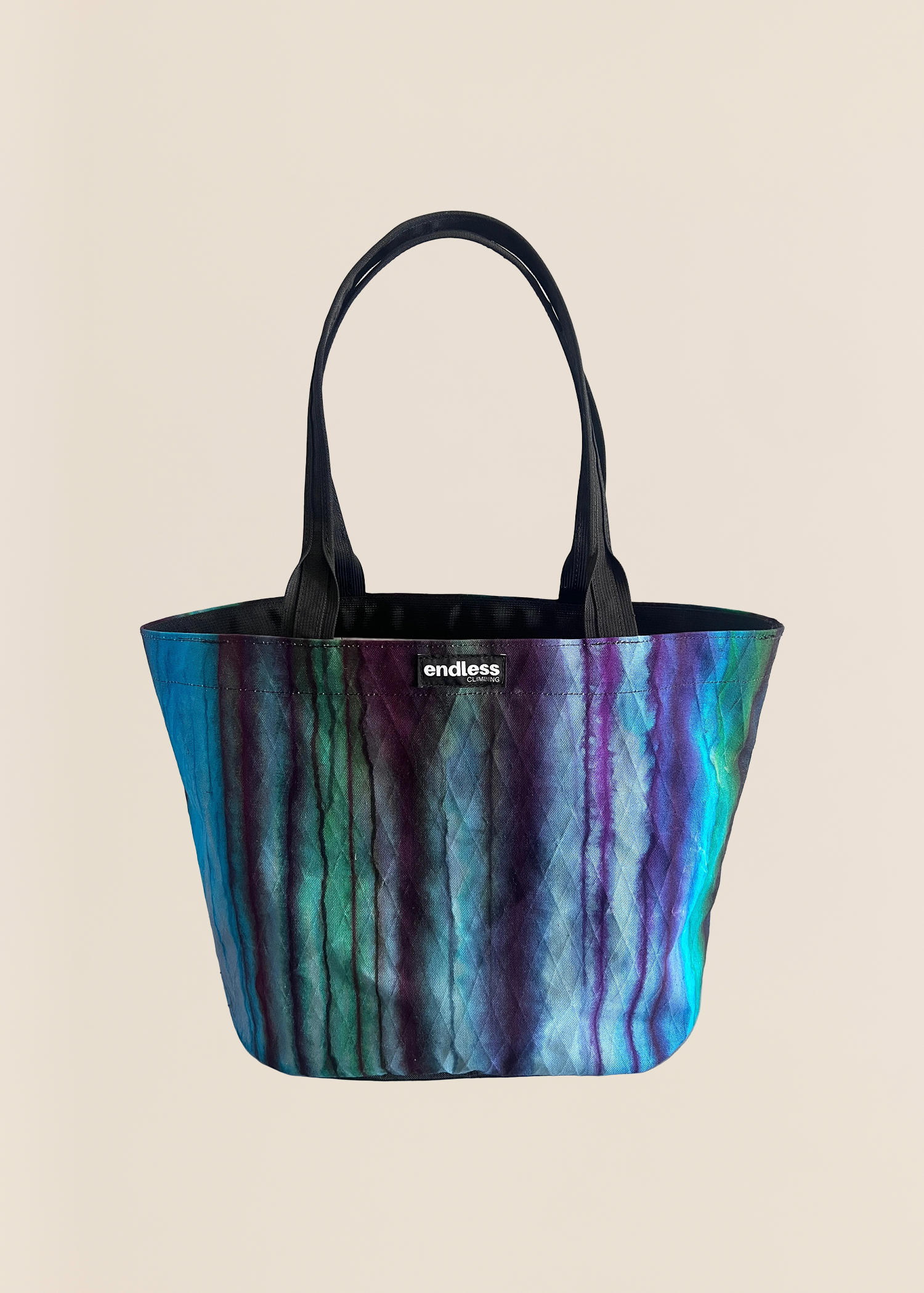 This is our new smaller tote, but with the Climb Choss tie dye touch. One compartment, 2 handles and an interior zipper pocket sewn into the liner! Bottom is Ultra 400TX for max durability. 30L capacity. The first run supply on these is limited!